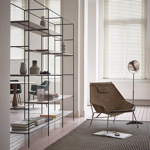 Cabinet with rectangular elements and 3 columns wide. Frame color is matt black. The shelves are made in Forbo desktop.