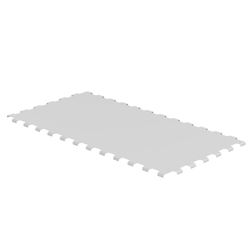 Metal shelf finished with a powder coating. The shelves are self-supporting due to the toothed shape. Plank carriers are therefore not necessary.