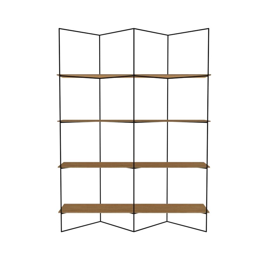 Modulaire boekenkast met een diagonaal frame en 4 lagen. Uitgevoerd met houten legborden afgewerkt met eiken fineer. Het speelse ontwerp geeft deze modulaire kast een bijzondere uitstraling.