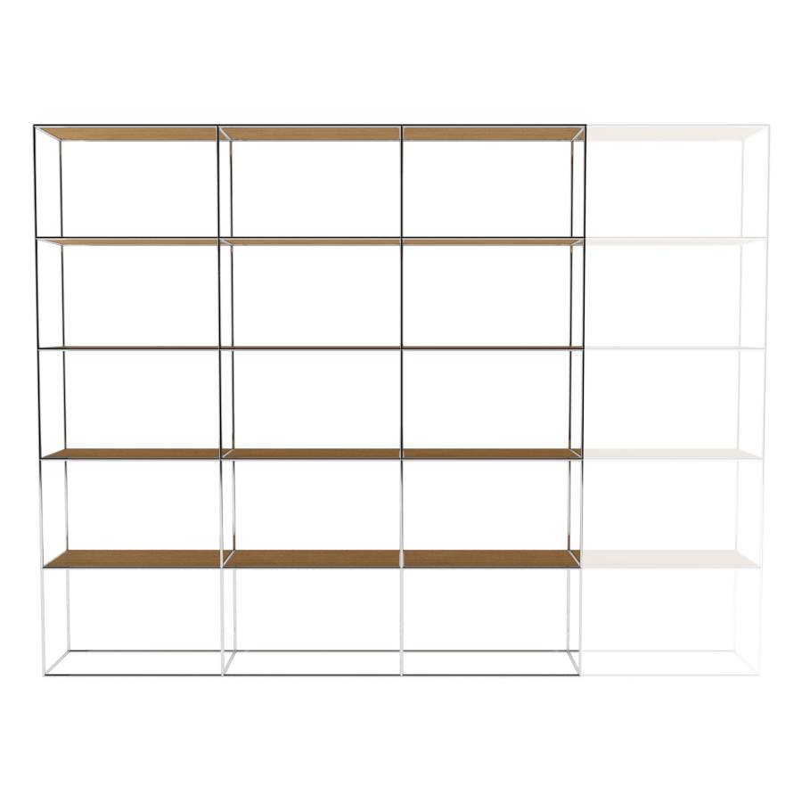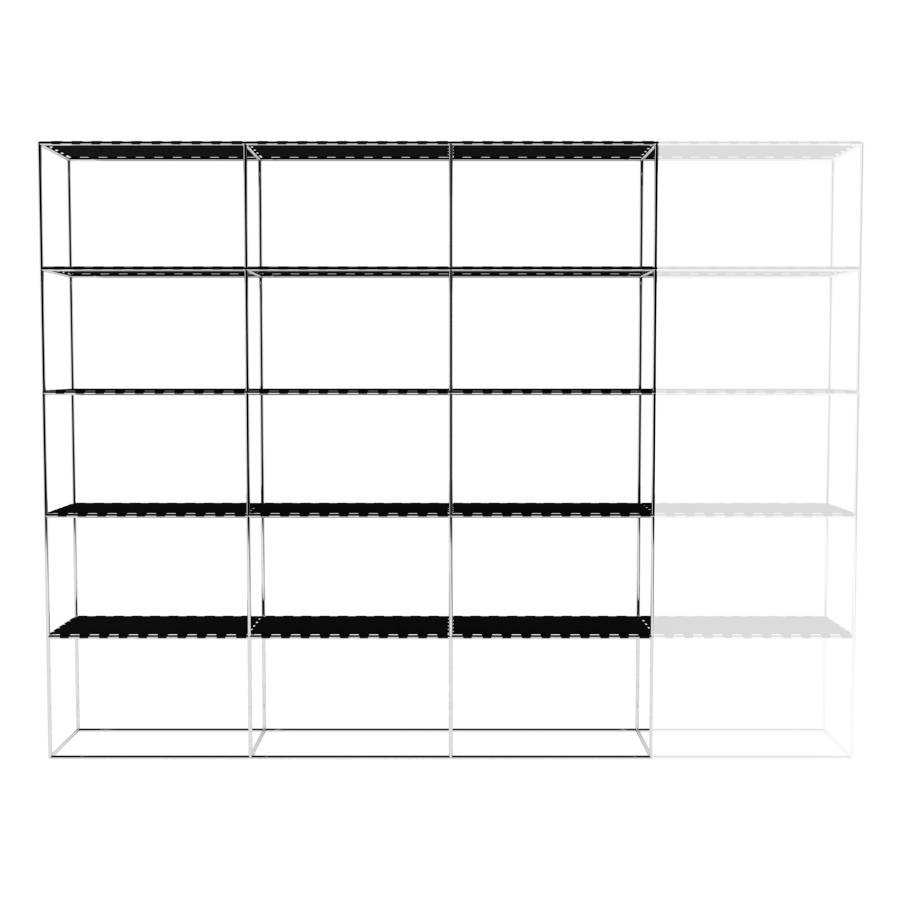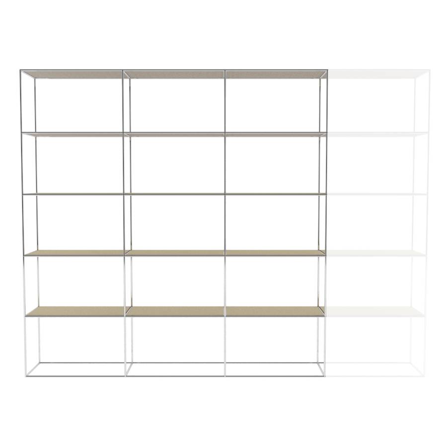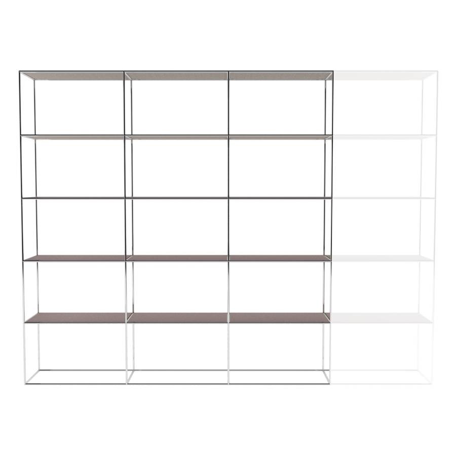 Modulaire kast met rechthoekige elementen en 4 kolommen breed. Framekleur is chroom. Keuze uit diverse planken/ legborden.