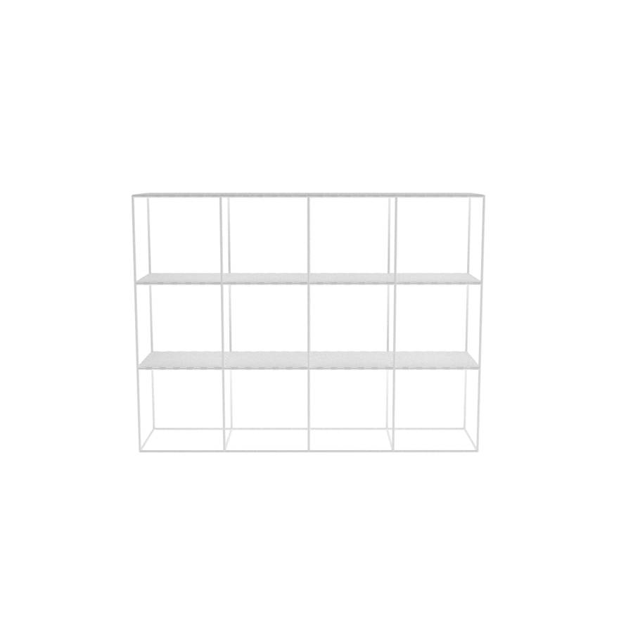 Modulaire open kast met vierkante elementen en 4 kolommen breed. Metalen frame en de metalen Classic legborden zijn wit.